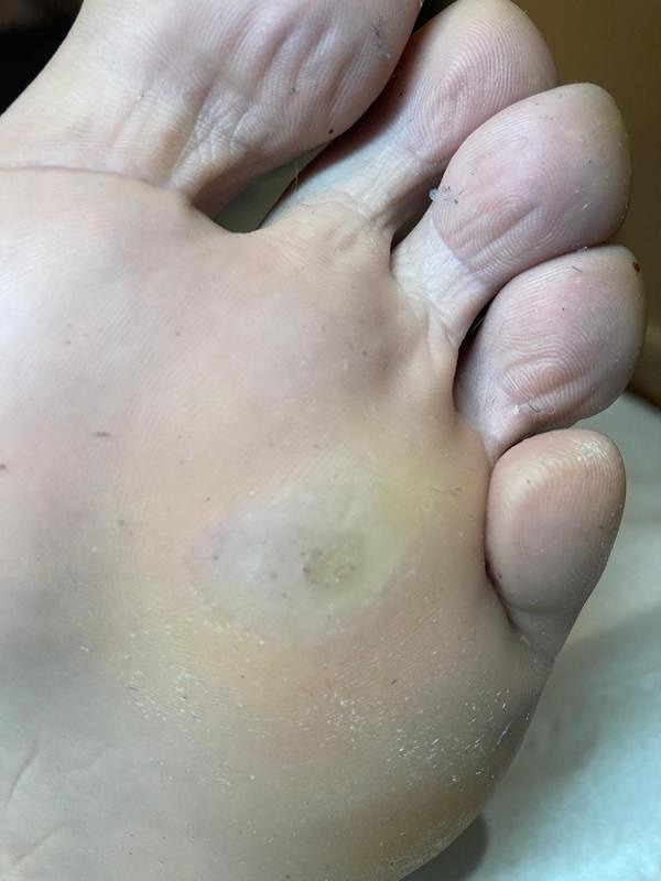 Plantar warts (verrucae) are found on the feet, commonly on the sole. They tend to be pink or flesh-coloured with a black dot in the centre, which represents small clotted blood vessels.